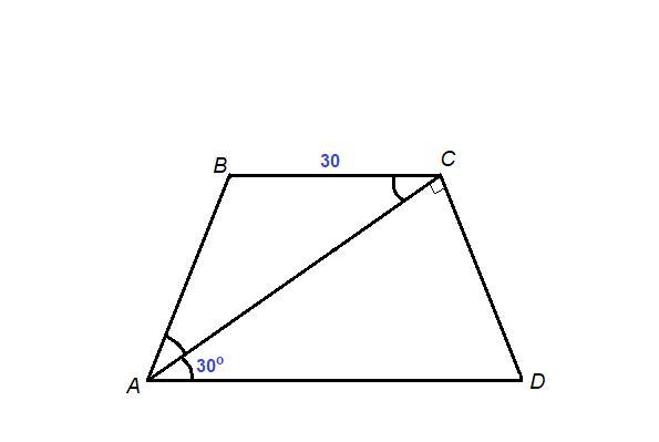 ∠BCA = ∠CAD = 30° как внутренние накрест лежащие при пересечении AD║ВС секущей АС.