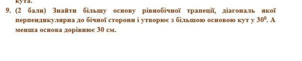 Знайти більшу основи рівнобічної трапеції, діагональ якої перпендикулярна до бічної сторони і утворює з більшою основою кут у 30° .