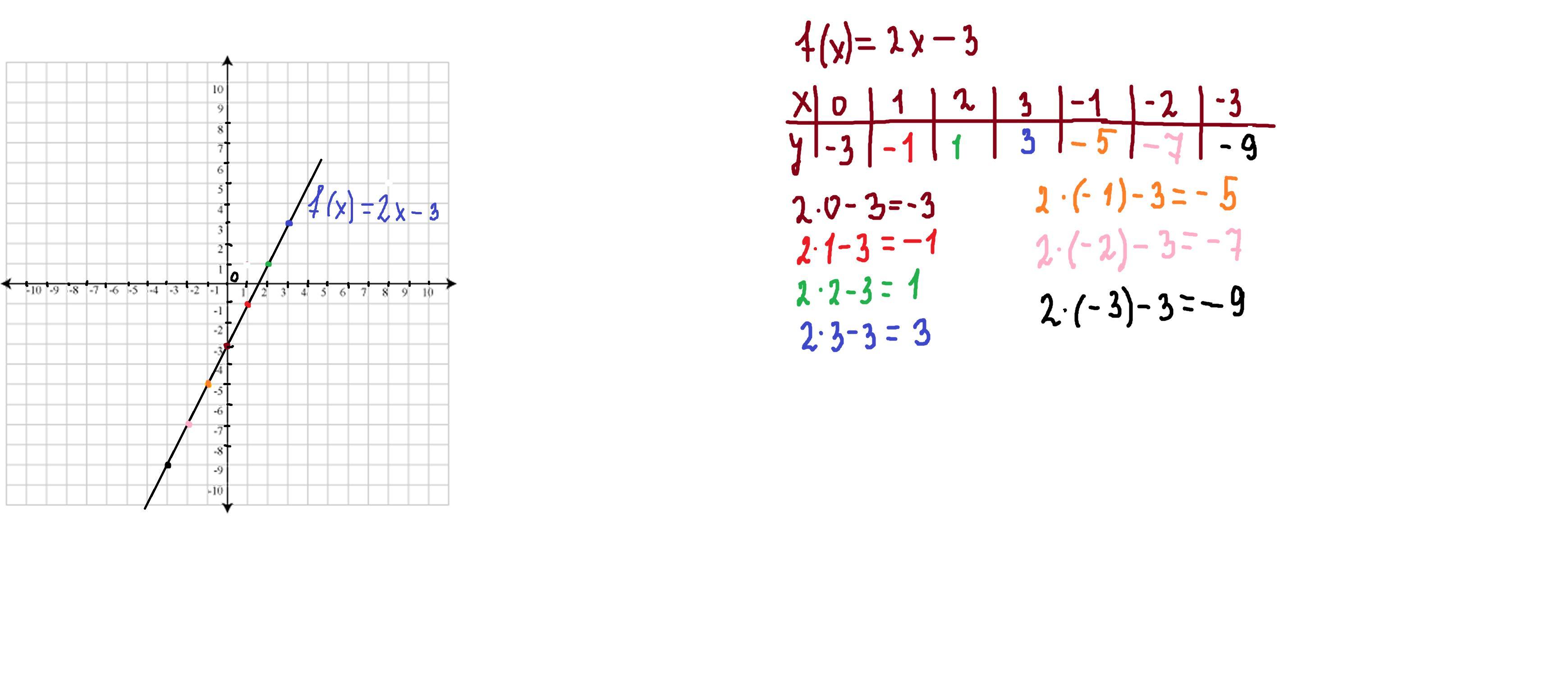 Для построения графика f(x)=2x-3 ,которым является прямая необходимо знать только значение функции в двух точках,потому что для построения прямой достаточно двух точек.Но если хотите,то можете найти значение ещё в нескольких точках.Для этого в функцию вместо Х подставляем числа и вычисляем значение.Таблица внизу.