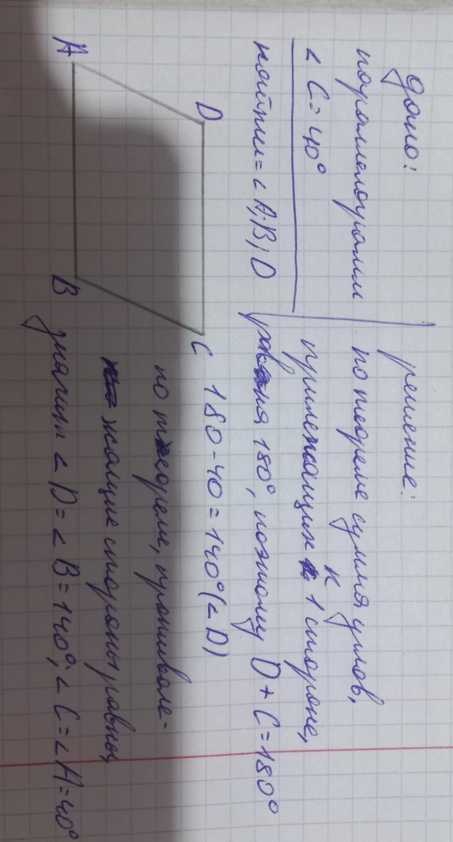Условие задания: Вычисли остальные углы параллелограмма, если угол C равен 40°. ∆ B = ? , ∆ A = ? , ∆ D =?
