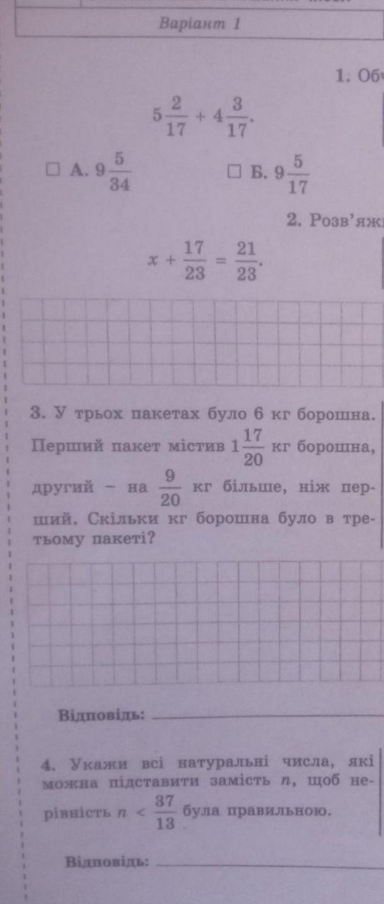4) 5 20/20 - 4 3/20= 1 17/20 (в третьем пакете)