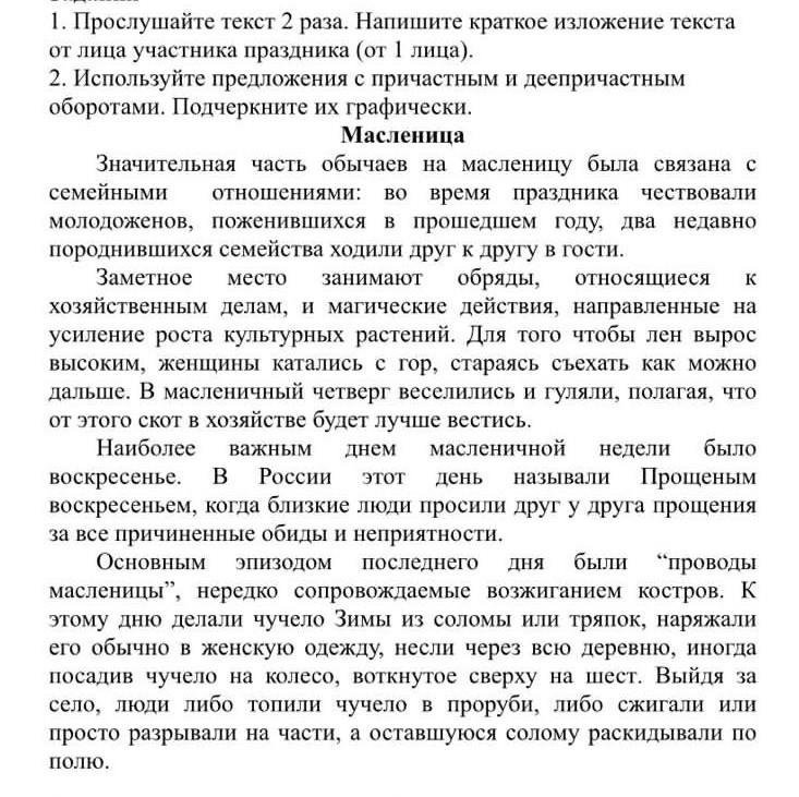 1. Прослушайте текст 2 раза. Напишите краткое изложение текста от лица участника праздника (от 1 лица). 2. Используйте предложения с причастным и деепричастным оборотами. Подчеркните их графически.