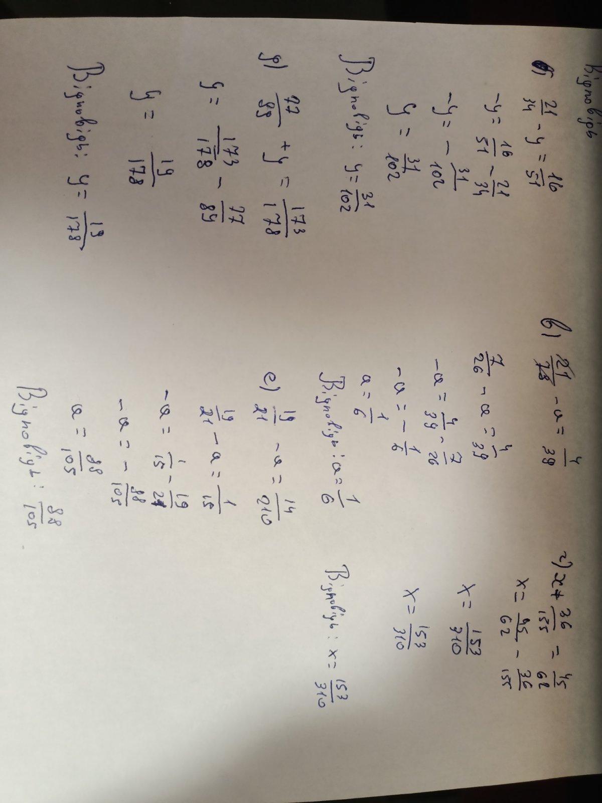 a) X = 85/172, в) Y = 31/102 б) а = 1/6, г) Х = 153/310, д) У = 19/178, е) А = 88/105