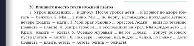 Утром школьники бегут в школу. После уроков дети бегают и играют во дворе. Мы идем в кино. Мы ходим по парку, наслаждаясь прохладой летнего вечера. Мой брат отлично плавает брассом. Лодка плывет вниз по течению. Завтра геологи уезжают в экспедицию на Урал. Мы каждое утро едем в Крым. Осенью журавли улетают на юг. Пчелы летают вокруг розового куста. На озере плавают лебеди, над водой летают чайки, по пляжу бегают дети.