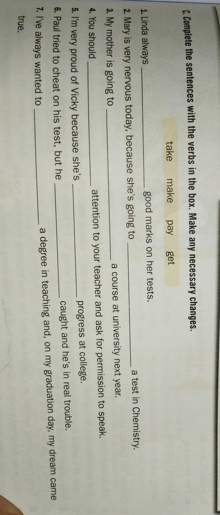 1) gets; 2) make; 3) take; 4)pay; 5)making; 6) got; 7) take