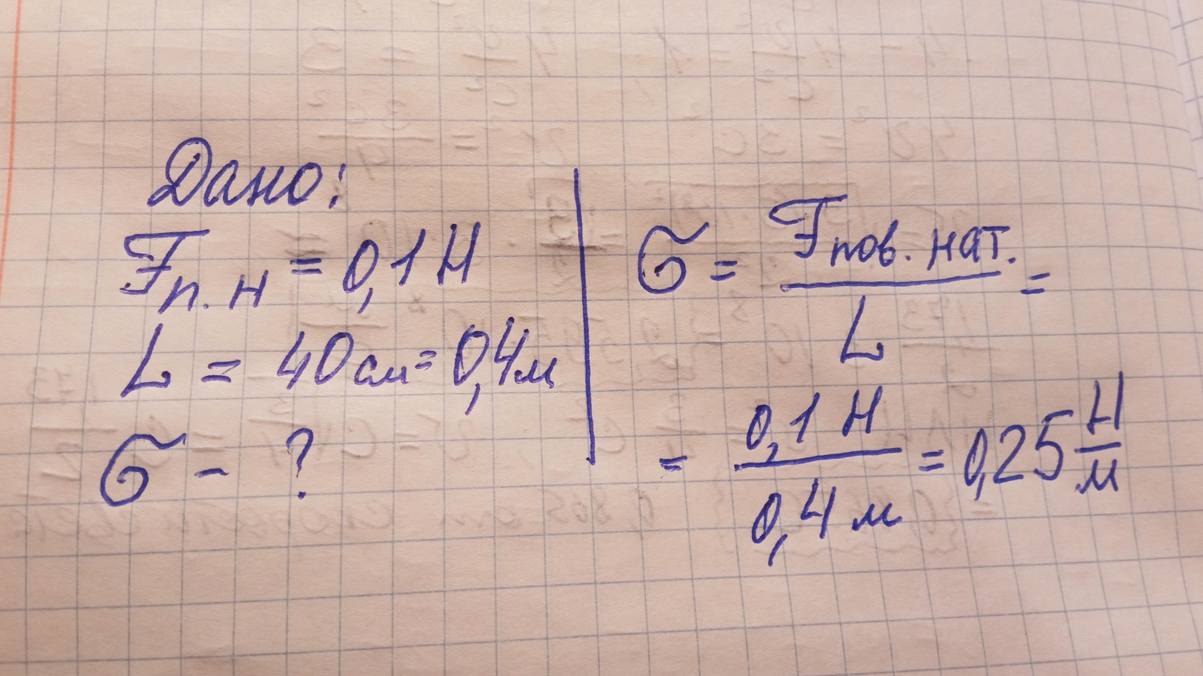 Сила поверхностного натяжения равна 0,1 н. длина линии, ограничивающая поверхность 40 см. Чему равно поверхностное натяжение жидкости?