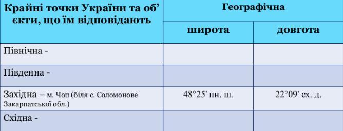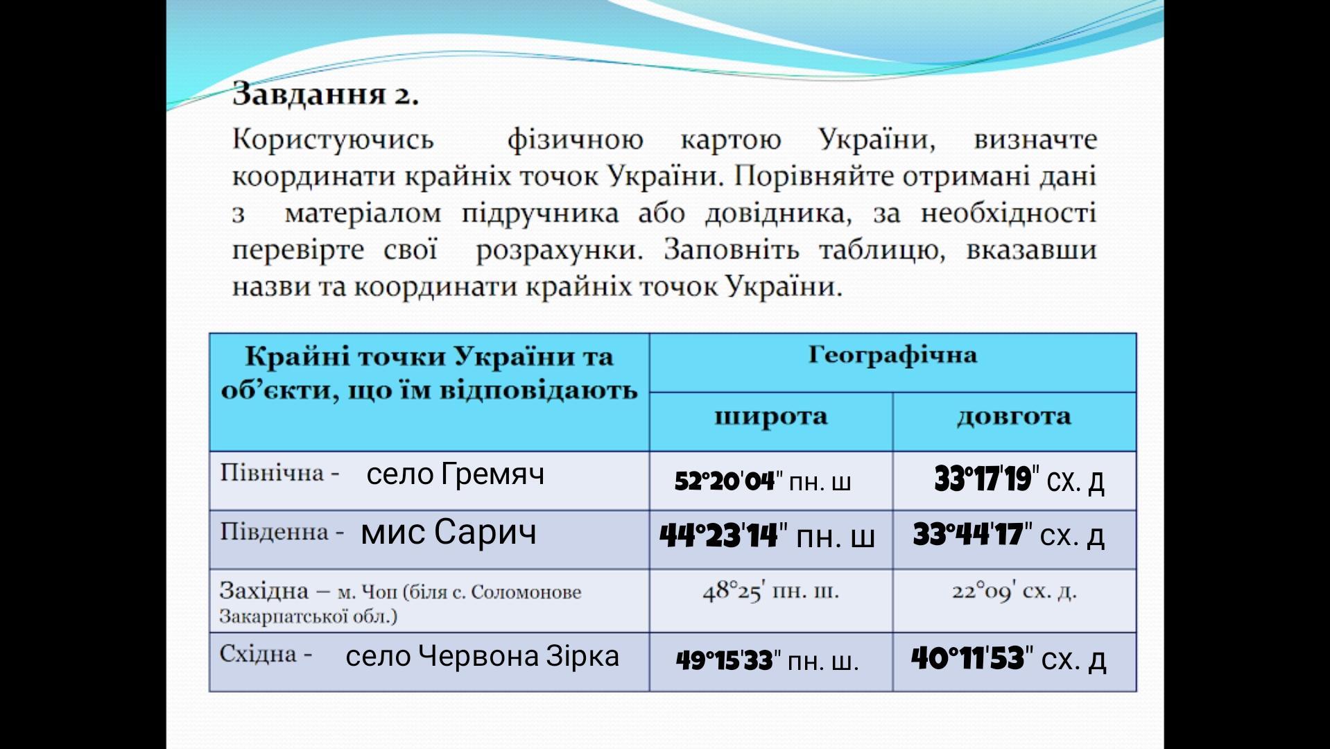 крайніх точок України. Порівняйте отримані дані з матеріалом