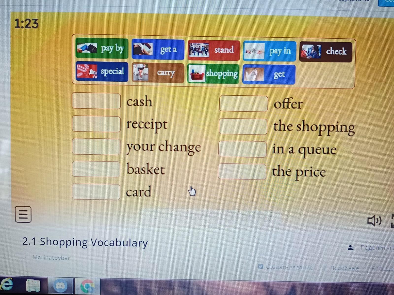 Відповідь:pay by card, pay in cash, stand in a queue, special offer, carry the shopping , get a receipt, shopping basket, check the price, get your change