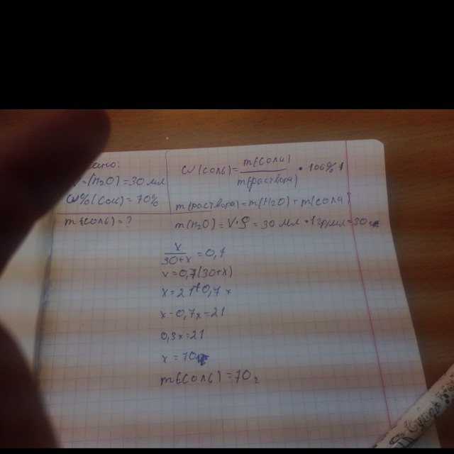 Сколько граммов соли надо взять для приготовления 70% раствора если взято 30 мл воды. Там нужно за х взять соль и уравнением