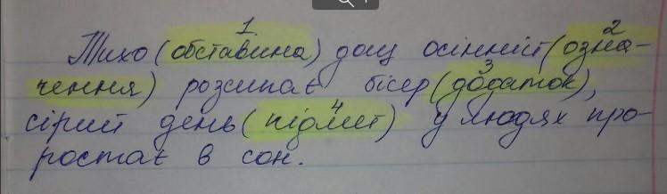 (1) Тихо дощ (2) осінній розсипає (3) бісер, сірий (4) день у людях проростає в сон.