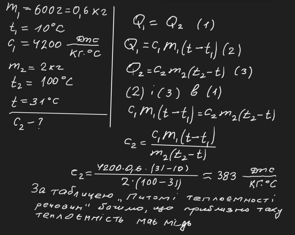 у воду масою 600 г, температура якої 10 градусів, опустили металеву деталь масою 2 кг. Температура води підвищилась до 31 градуса. З якого металу зрублена деталь якщо її початкова температура 100 градусів