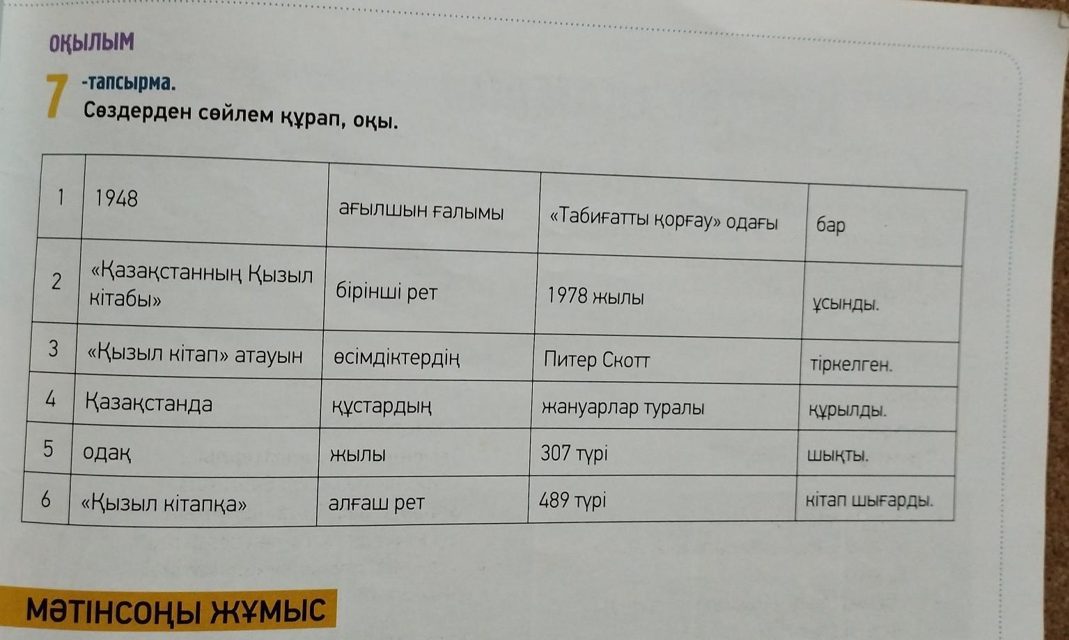 ОҚЫЛЫМ 7 2 1 1948 LO -тапсырма. Сөздерден сөйлем құрап, оқы. 3 «Қызыл кітап» атауын 4 | Қазақстанда 5 «Қазақстанның Қызыл кітабы>> одақ 6 | «Қызыл кітапқа» Матінсон JYVLIC ағылшын ғалымы бірінші рет өсімдіктердің құстардың ЖЫЛЫ алғаш рет Сущесть тельное «Табиғатты қорғау» одағы 1978 жылы Питер Скотт жануарлар туралы 307 түрі 489 түрі бар ұсынды. тіркелген. құрылды. шықты. кітап шығарды.
