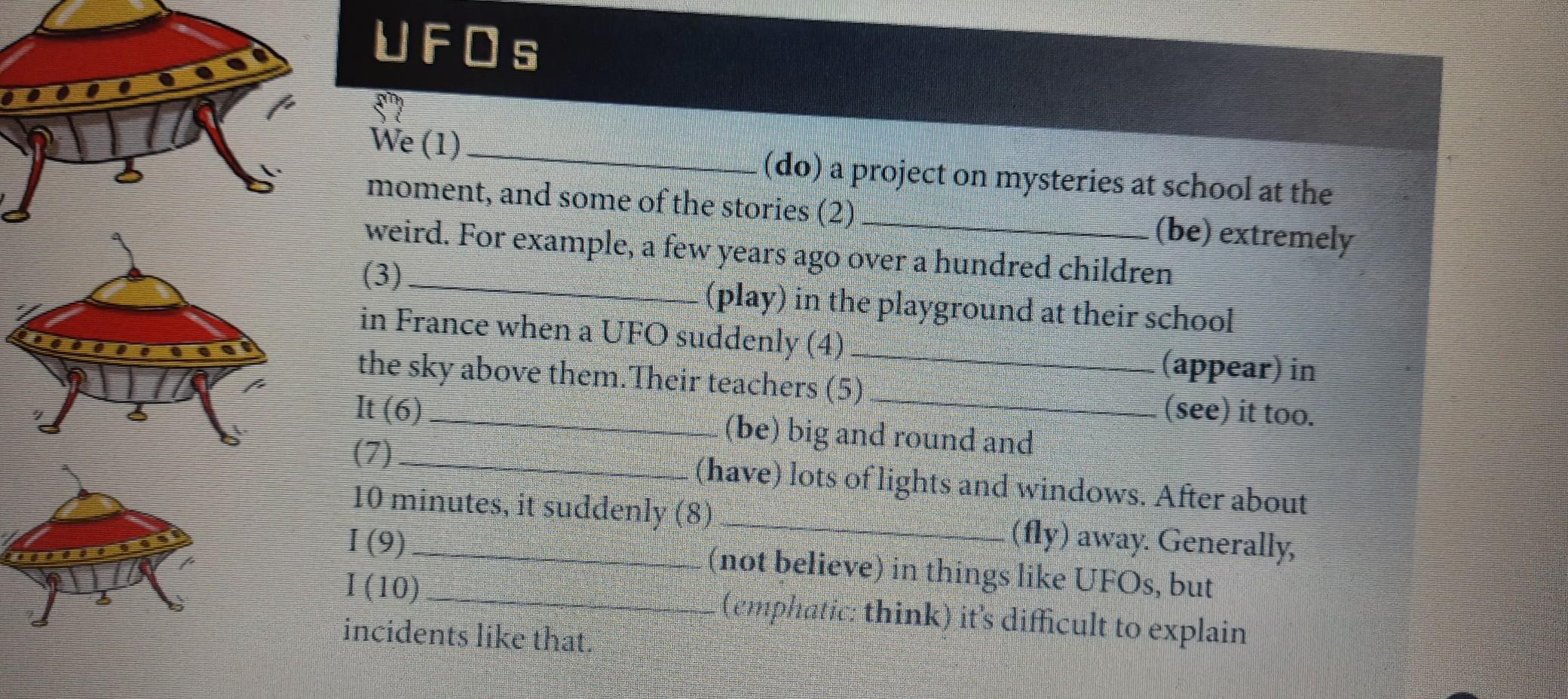 We (1). moment, and some of the stories (2) (do) a project on mysteries at school at the weird. For example, a few years ago over a hundred (3) (play) in the playground at their school (appear) in in France when a UFO suddenly (4) the sky above them. Their teachers (5) It (6). (be) big and round and (be) extremely children (see) it too. (7) (have) lots of lights and windows. After about 10 minutes, it suddenly (8) 119) (fly) away. Generally, 1(10) incidents like that. (not believe) in things like UFOs, but (emplatio think) it's difficult to explain