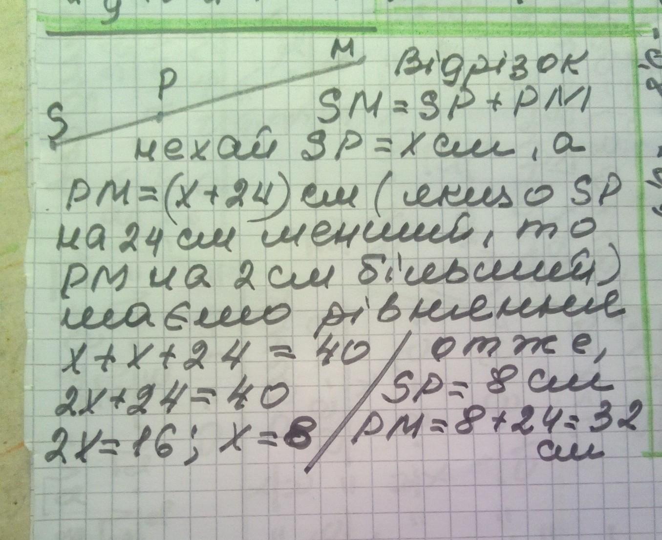 3. Точка Р належить відрізку SM, довжина якого дорівнює 40 см . Знайти довжини відрізків SP і РМ, якщо відрізок SP на 24 см