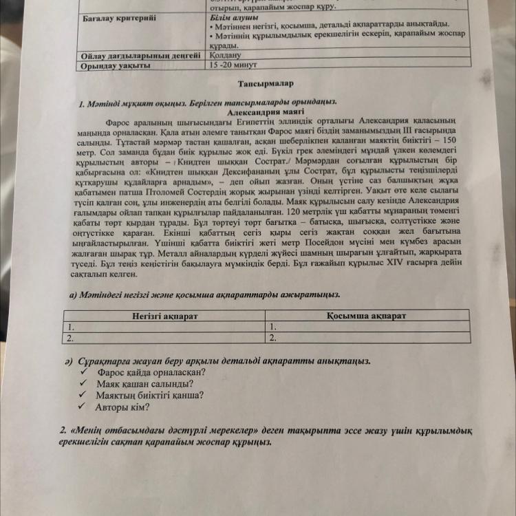 а) Мәтіндегі негізгі және қосымша ақпараттарды ажыратыныз.
