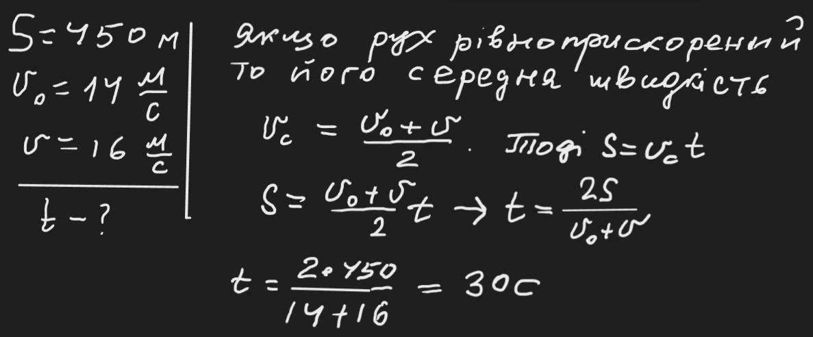 Автомобіль проїхав 450 м , швидкість руху якого змінювалася від 14 до 16 м/с. За який час проїхав автомобіль всю ділянку дороги?