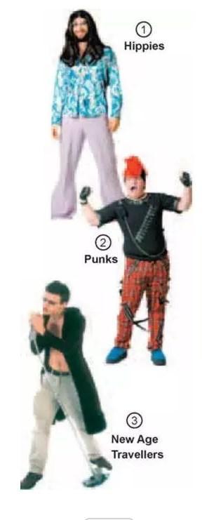 6 Read and choose the statements below according to the street styles shown on the right. Write in the appropriate number. They wear their hair long. They love extravagant dresses and hairstyles. They usually wear untidy clothes. They wear lots of rings, bracelets and bells. 0 0 They prefer to be free and not to work. They love wearing long robes or dresses and wide trousers. They like to wear their hair long with lots of colour threads in it. They pierce their noses and ears with pins. They wear sandals or walk barefoot (without shoes). They wear old black denim jeans. They have brightly dyed (painted) hair. They carry flowers. They love wearing boots on wooden sole. They show off their independence in wearing silver earrings and sometimes nose- rings. They are antifashion: they prefered wearing old clothes or making their clothes. Hippies Punks 3 New Age Travellers