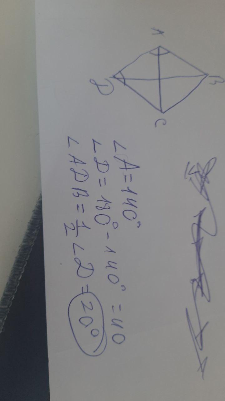 5. Кут ромба дорівнює 140°. Знайдіть кут між протилежною до цього кута діагоналлю і стороною ромба.