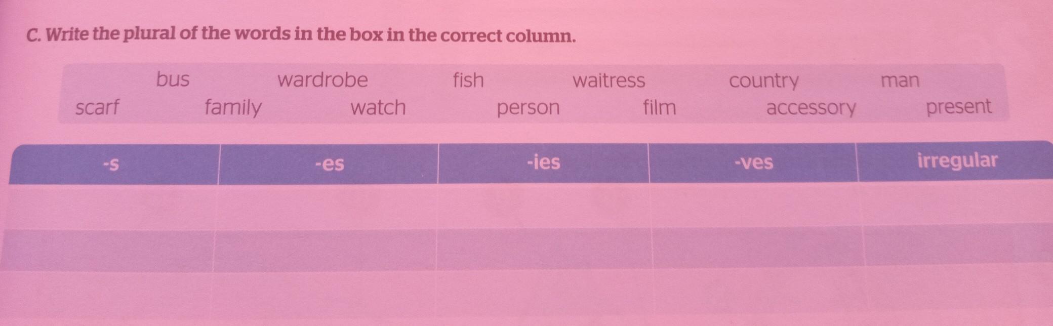 Ответ: Scarf-Scarves,Wardrobe-Wardrobes,Family-Families,