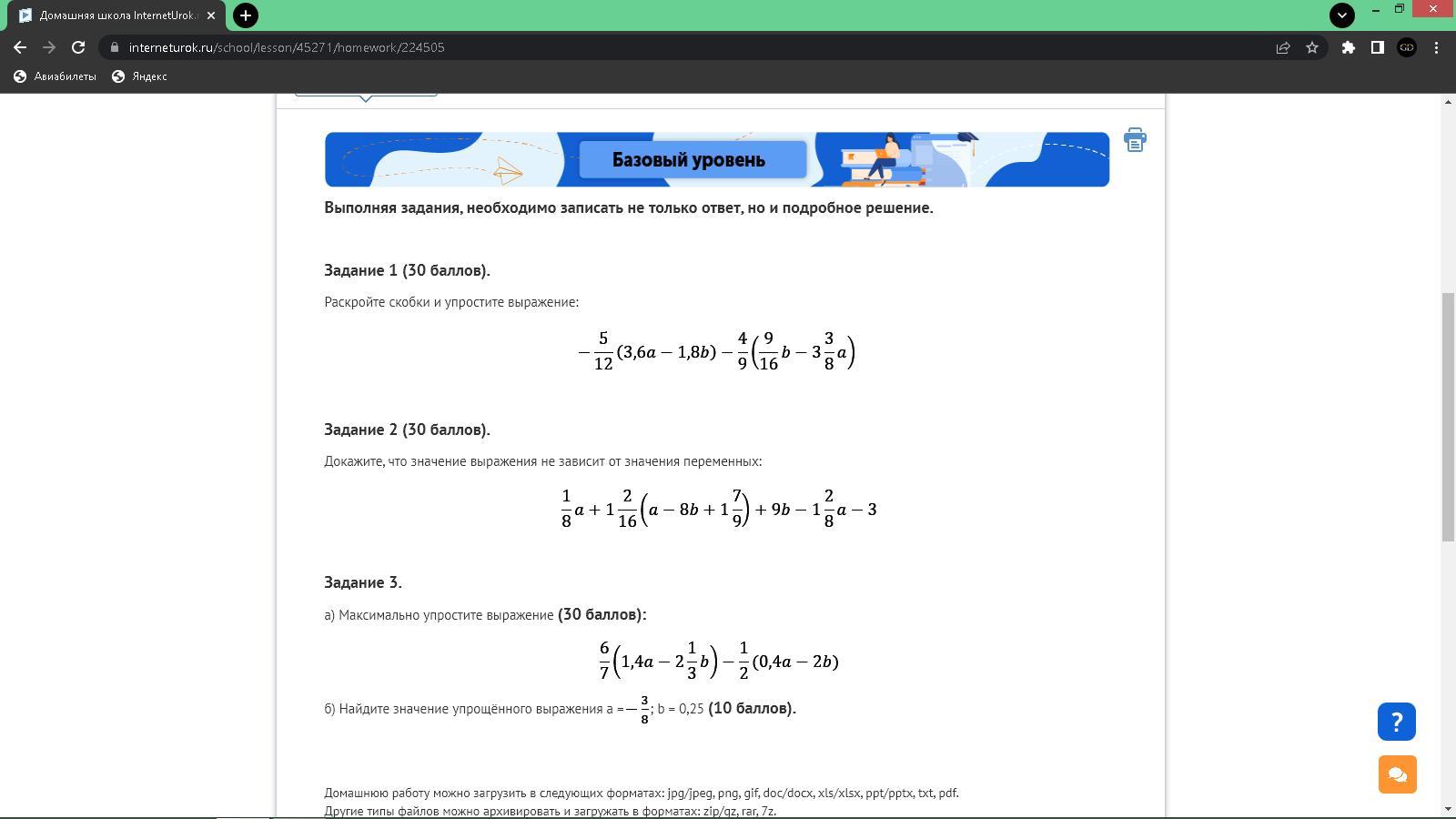 3. а) 6/7 ·(1,4a-2 1/3b) -1/2 ·(0,4a-2b)=6/7 ·(7/5 ·a -7/3 ·b) -1/2 ·(2/5 ·a-2b)=6/5 ·a-2b -1/5 ·a+b=a-b