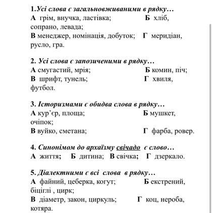 1 - А - Грім, внучка, ластівка (Слова загального вжитку використовують усі, незалежно від професії, наприклад. У варіанті Б не підходить сопрано, у В - добуток, у Г - меридіан).