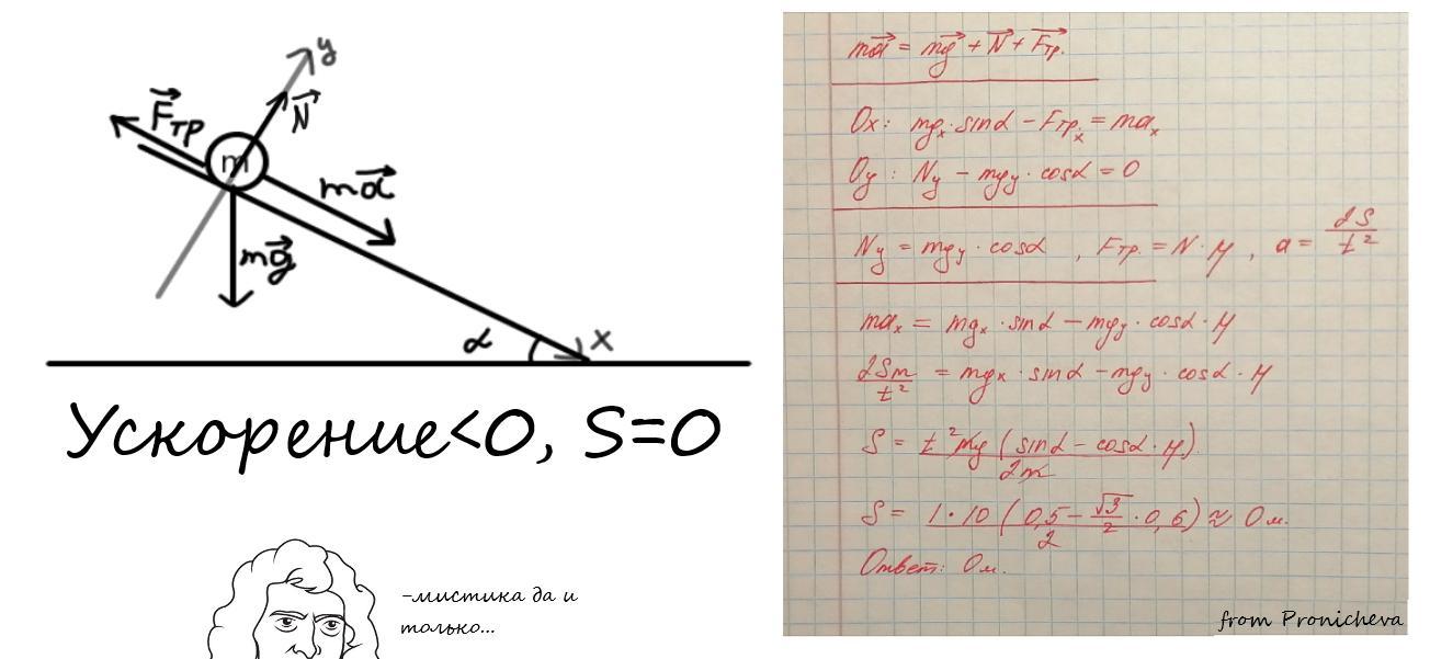 но мы - то понимаем, что это просто неточности подсчёта и округление значение синуса и косинуса. ну или неправдоподобные данные об угле наклона и коэффициенте трения