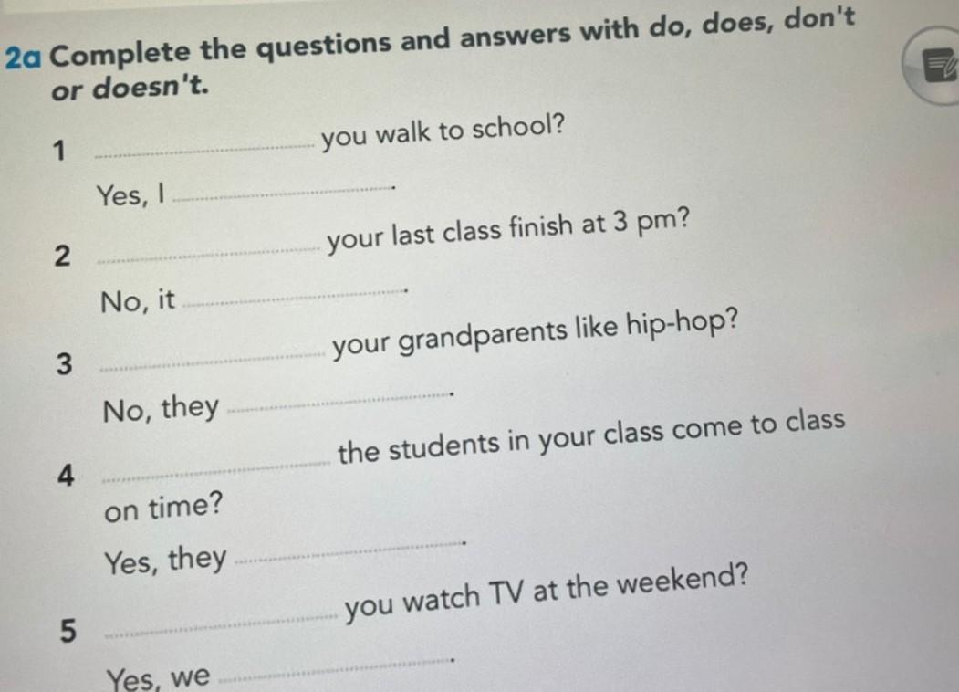 2a Complete the questions and answers with do, does, don't or doesn't. 1 2 3 4 5 Yes, I No, it No, they on time? Yes, they Yes, we you walk to school? your last class finish at 3 pm? your grandparents like hip-hop? the students in your class come to class you watch TV at the weekend?
