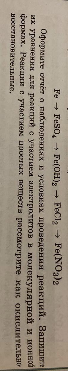 Оформите отчёт о наблюдениях и условиях проведения реакций. Запишите их уравнения для реакций с участием электролитов в молекулярной и ионной формах. Реакции с участием простых веществ рассмотрите как окислительно восстановительные.