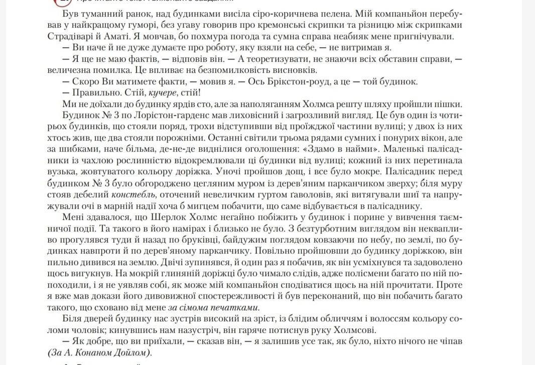 Був ранок. Мій компаньйон був у настрої, говорив про скрипки та рiзницю мiж Страліварі й Аматі . Я мовчав , бо похмура погода та сумна справа неабияк мене пригнічували . - Ви наче не дуже думаете про роботу , - не витримав я . - Я ще не маю фактів , - відповів він . - А теоретизувати , не знаючи всіх обставин , - це погано . Це впливає на висновок - Скоро Ви матимете факти , - мовив я . - Ось Брiкстон - роуд , а це - той будинок . - Правильно . Стій!Ми не доїхали до будинку , але за наполяганням Холмса решту шляху пройшли пішки . Будинок № 3 по Лорiстон - гардене мав загрозливий вигляд . Це був один із чотирьох будинків , що стояли поряд , трохи відступивши від проїжджої частини вулиці : у двох з них хтось жив , ще двоє порожніми . Останні світили трьома рядами сумних вікон , але за шибками , де - не - де виднілися оголошення : « Здамо в найми » . Палісадники з чахлою рослинністю відокремлювали ці будинки вiд вулиці : кожний із них перетинала вузька , жовтувата дорiжка . Уночі був дощ , і все було мокре . Палісадник перед будинком № 3 було обгороджено муром із парканчиком зверху : біля муру стояв дебелий констебль , оточений гуртом гаволовів , які витягували шиб та напружували очі, щоб хоча б митцем побачити , що саме відбувається в палісаднику . Мені здавалося , що Шерлок Холме побіжить у будинок і порине у вивчення таемничої події . Та про таке він не думав. вiн неквапливо по прогулявся туди й назад, дивлячись на небо, на землю, на будинки. Пройшовши до будинку доріжкою , він дивився на землю, двічі зупинявся , й один раз я побачив , як він усміхнувся та щось вигукнув. На доріжці було чимало слідів, адже полісмени по ній походили , і я не розумів , як мій компаньйон зможе щось на ній прочитати . Проте я вже мав докази його спостережливості й був переконаний , що він побачить, що сховано від мене за сімома печатками . Біля дверей будинку нас зустрiв високий , блідий, світлявий чоловік , кинувшись нам назустріч , вiн потиснув руку Холмсові . - Як добре , що ви приïхали,я залишив усе так , як було , ніхто нічого не чіпав.