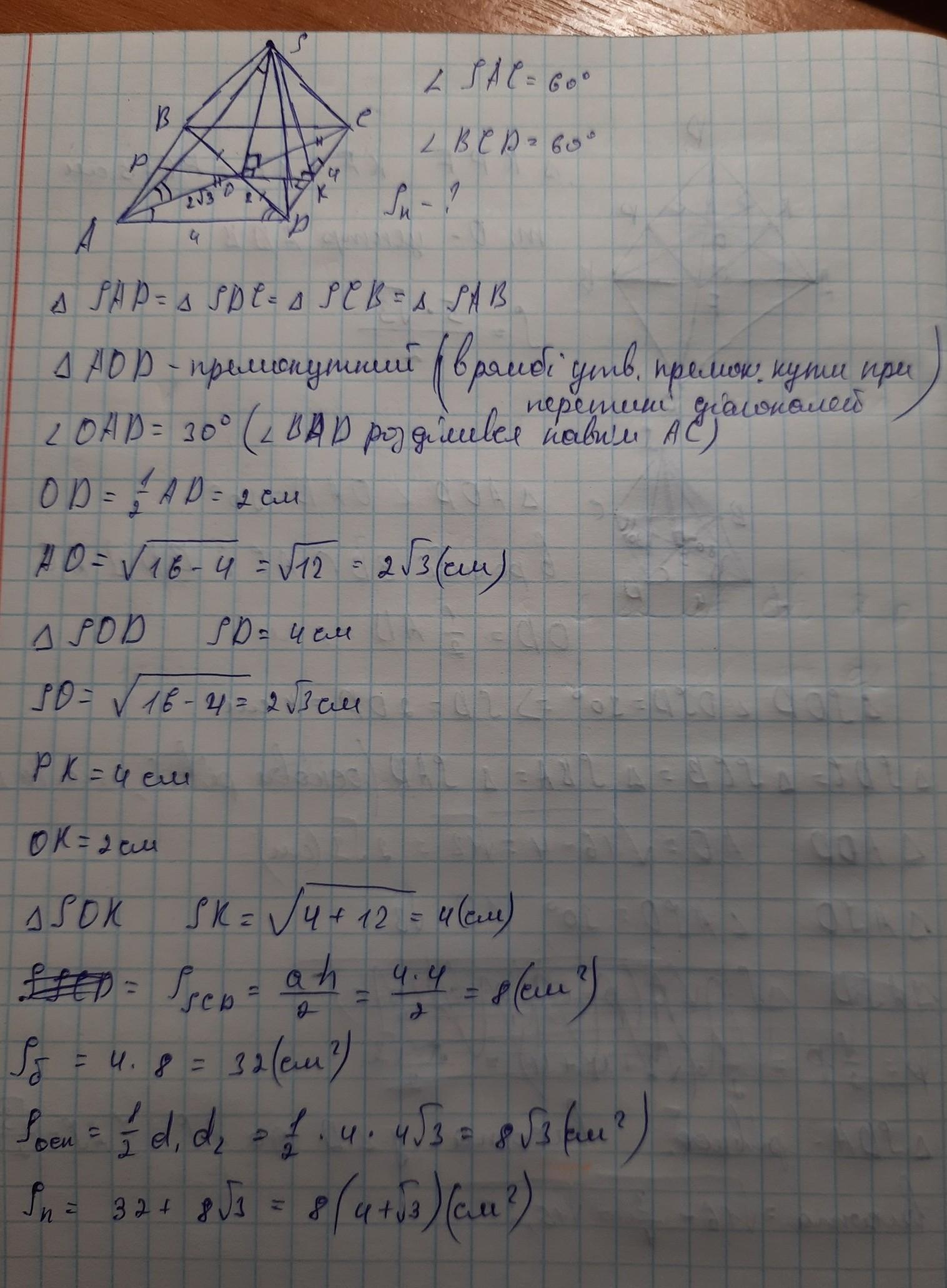 В основі піраміди лежить ромб сторона якого 4 см, а гострий кут 60°, усі двогранні кути при основі дорівнюють 60°. Знайти площу поверхні цієї піраміди