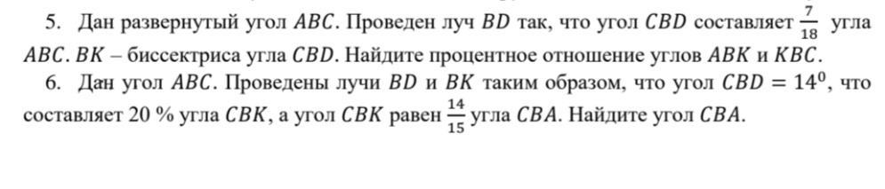 Дан развернутый угол АВС. Проведен луч BD так, что CBD =7/18 угла ABC, BK - биссектриса CBD. Найти процентное соотношение ABK, KBC. задача 5