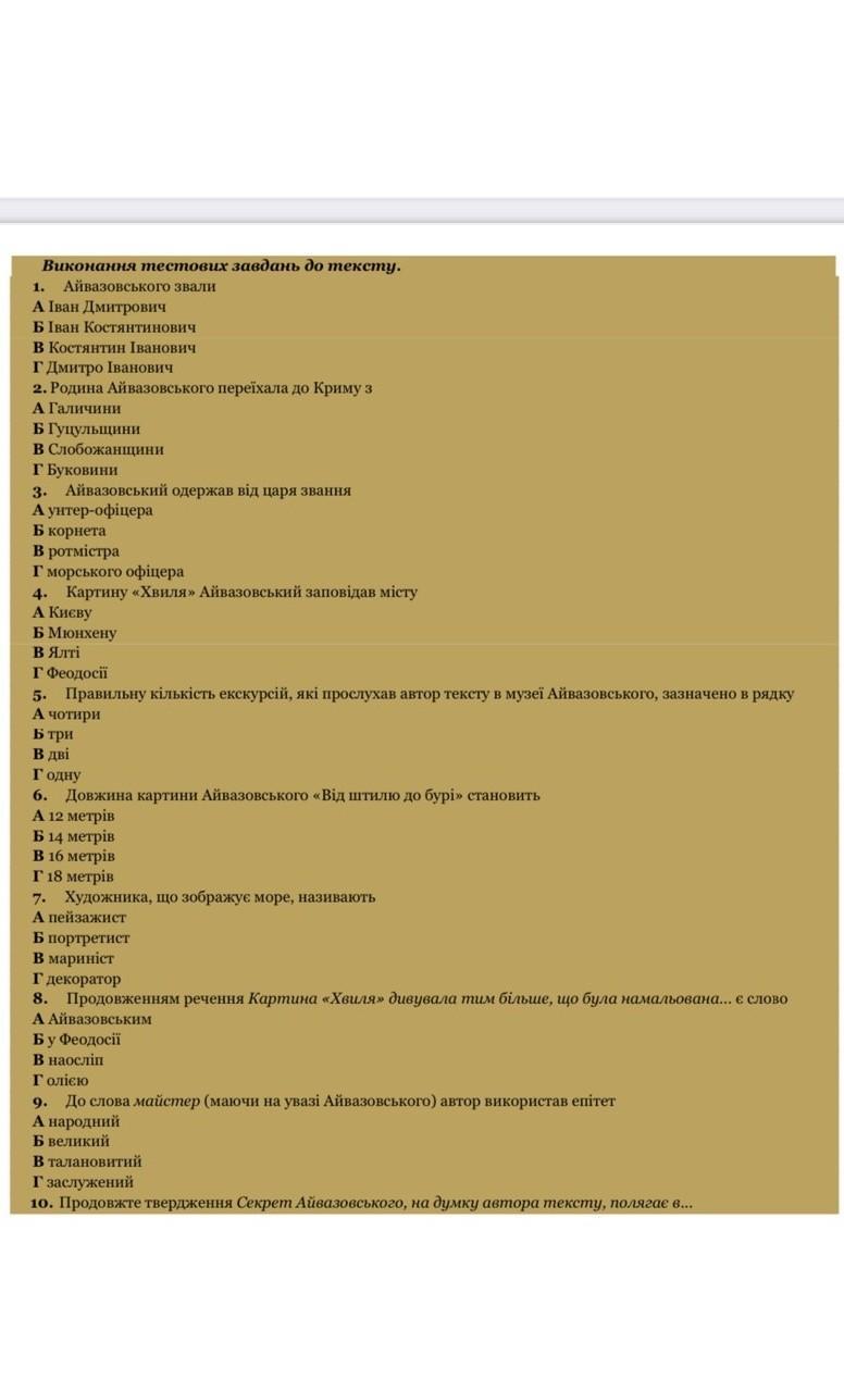Виконання тестових завдань до тексту. 1. Айвазовського звали А Iван Дмитрович Б Іван Костянтинович В Костянтин Іванович Г Дмитро Іванович 2. Родина Айвазовського переїхала до Криму з А Галичини Б Гуцульщини В Слобожанщини Г Буковини 3. Айвазовський одержав вiд царя звання А унтер-офіцера Б корнета В ротмістра Г морського офіцера 4. Картину «Хвиля» Айвазовський заповідав місту А Києву Б Мюнхену В Ялті Г Феодосії 5. Правильну кількість екскурсій, які прослухав автор тексту в музеї Айвазовського, зазначено в рядку А чотири Б три В двi Г одну 6. Довжина картини Айвазовського «Вiд штилю до бурi» становить A 12 метрiв Б 14 метрів В 16 метрів Г 18 метрів 7. Художника, що зображує море, називають А пейзажист Б портретист В мариніст Гдекоратор 8. Продовженням речення Картина «Хвиля» дивувала тим більше, що була намальована... Є слово А Айвазовським Бу Феодосії В наосліп Г олією 9. До слова майстер (маючи на увазі Айвазовського) автор використав епітет А народний Б великий В талановитий Г заслужений 10. Продовжте твердження Секрет Айвазовського, на думку автора тексту, полягає в...
