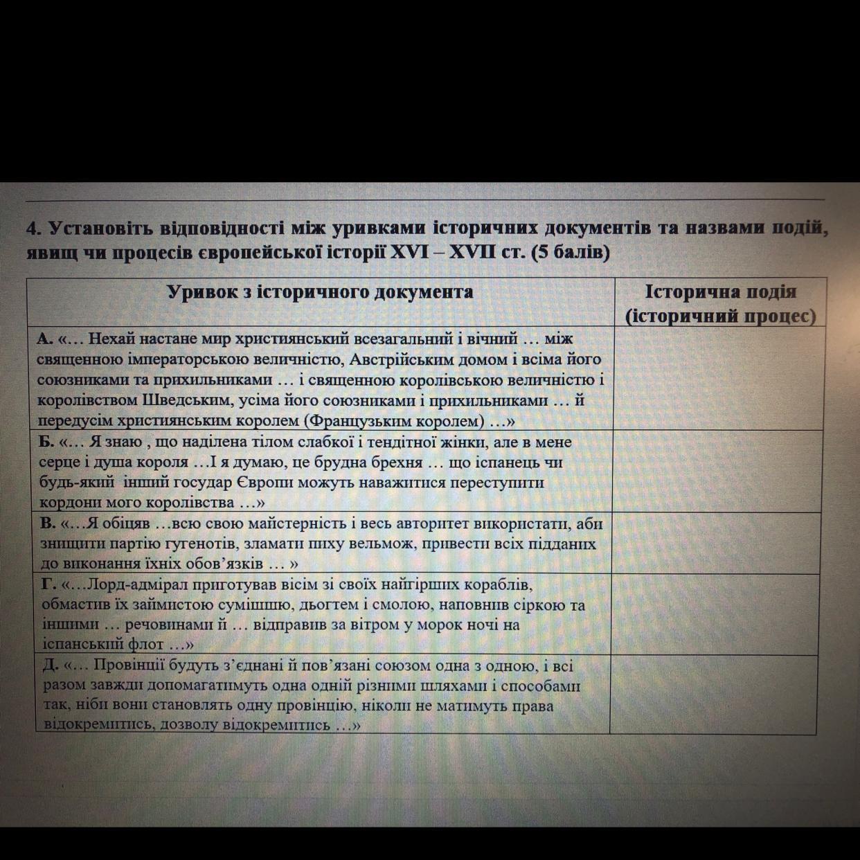4. Установіть відповідності між уривками історичних документів та назвами подій,