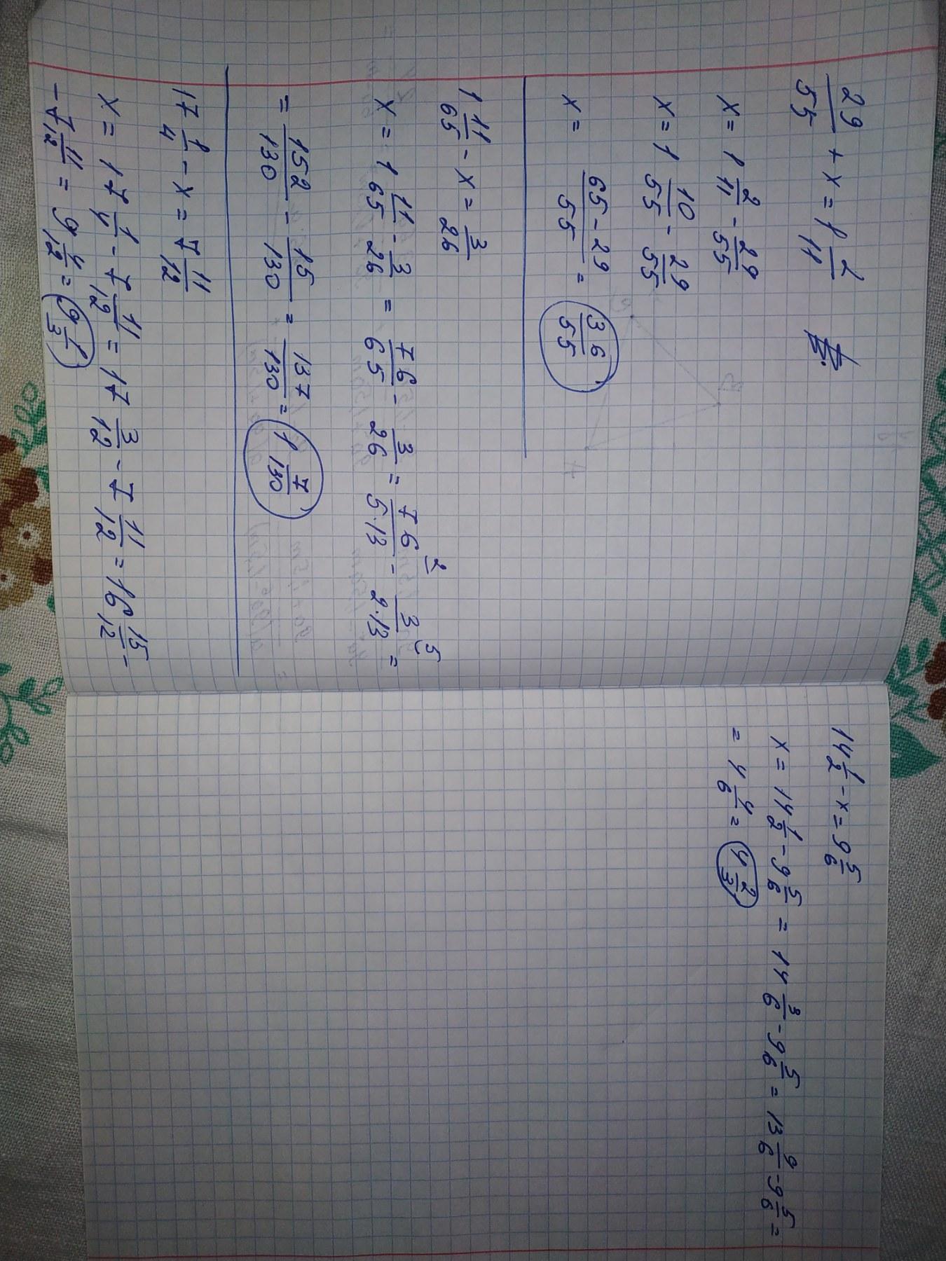 29/55 + x = 13/11 76/65 - x = 3/26