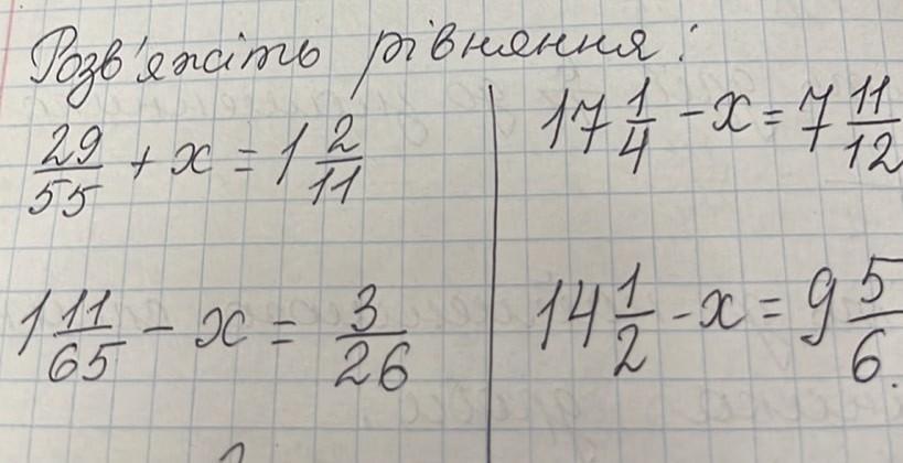 1. 29/55 + x = 1 2/11 2. 1 11/65 - x = 3/26