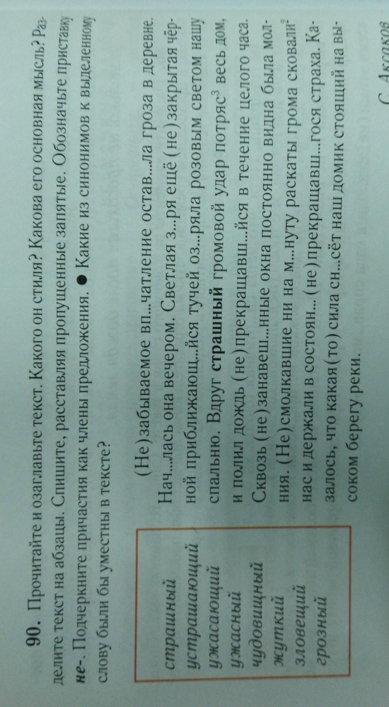 90. Прочитайте и озаглавале текст. Какого он стиля? Какова его основная мысль? Раз- делите текст на абзацы. Спишите, расставляя пропущенные запятые. Обозначьте приставку - Почее причастия как члены предложения. Какие из синонимов к выделенному слову были бы уместны в тексте? страшный устрашающий ужасающий ужасный чудовищный жуткий зловещий грозный (Не)забываемое вп...чатление остав...ла гроза в деревне. Начлась она вечером. Светлая з...ря ещë (не) закрытая чер- ной приближающйся тучей зряла розовым светом нашу спальню. Вдруг страшный громовой удар потряс3 весь дом, и полил дождь (не)прекращавш..йся в течение целого часа. Сквозь (не)занавеш...нные окна постоянно видна была мол- ния. (Не)смолкавшие ни на м..нуту раскаты грома сковали нас и держали в состоян... (не)прекращавш..гося страха. Ка- залось, что какая (то) сила снсёт наш домик стоящий на вы- соком берегу реки. С. Аксаков