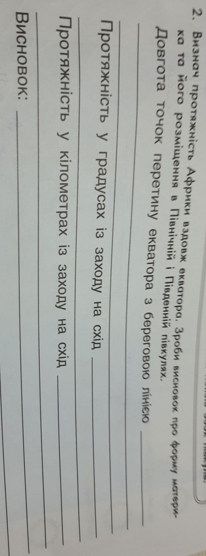 Висновок: Африка має найбільшу протяжність з заходу на схід у Північній півкулі, тому тут розташована більша частина материка, мешна частина відповідно у Південній півкулі.