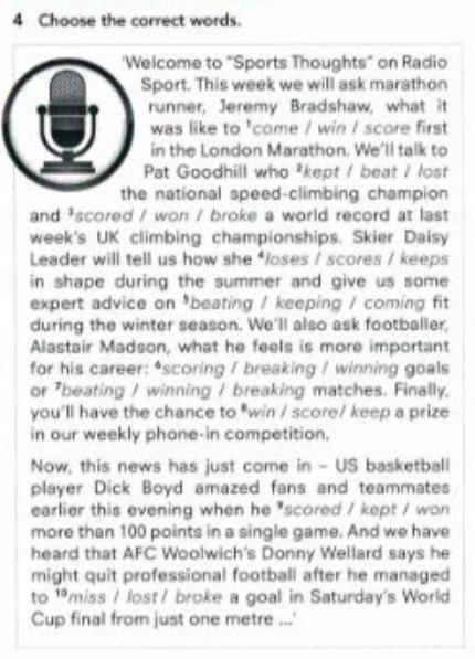 4: 1- win, 2- beat, 3- broke, 4- keeps, 5- coming, 6- scoring, 7- winning, 8- win, 9- scored, 10- miss