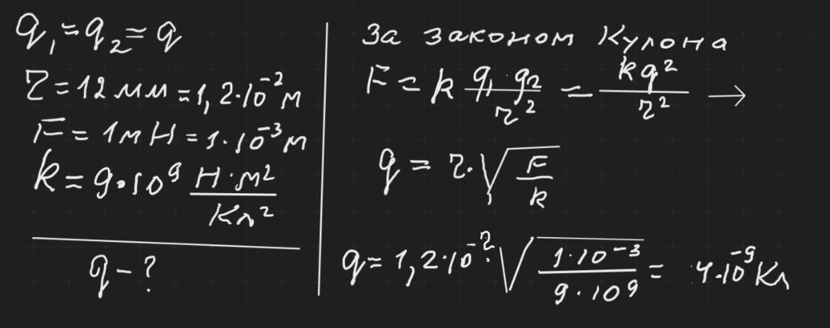 12*10⁻³/3 * √10⁻³⁻⁹=4*10⁻³√10⁻¹²=4*10⁻³⁻⁶=4*10⁻⁹Кл=4 нКл.