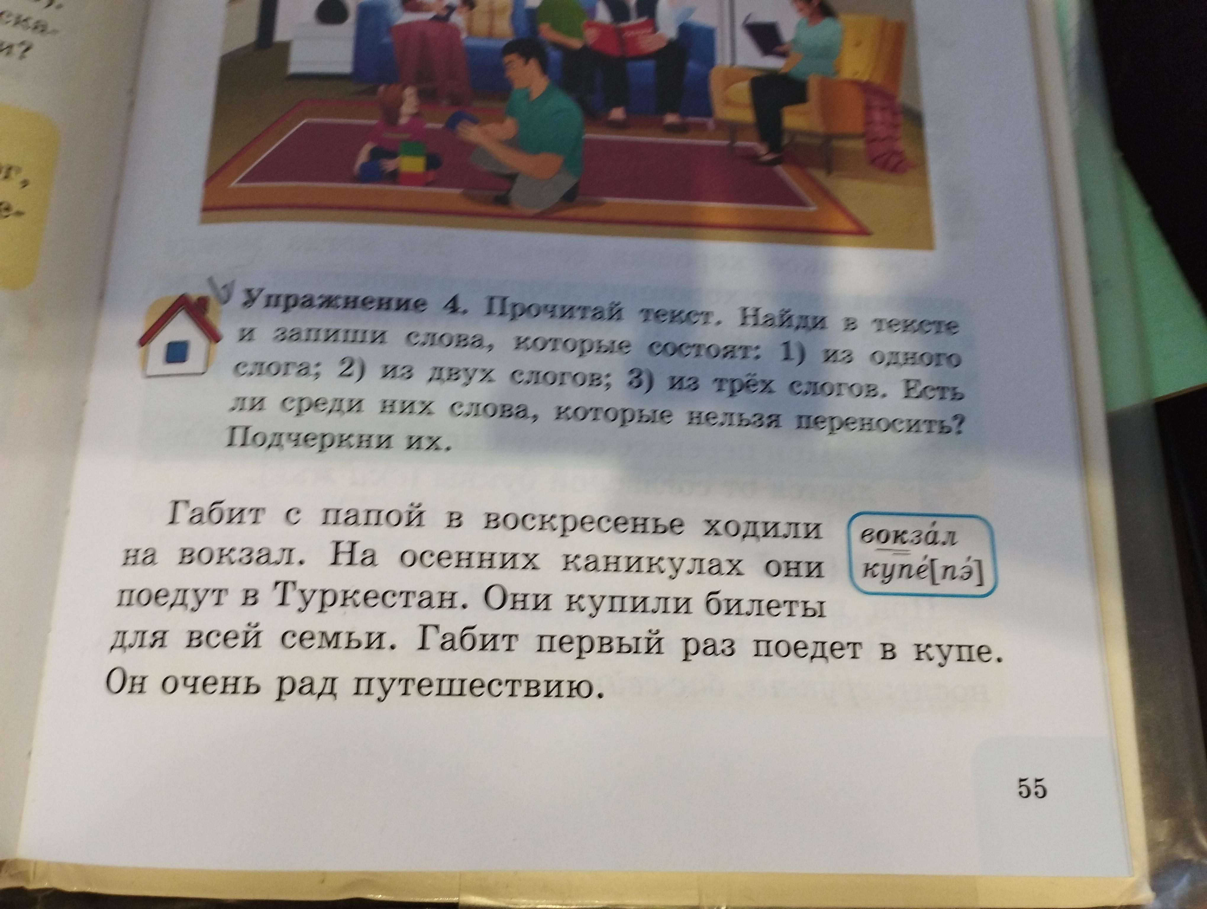 Упражнения 4. Прочитай текст.Найдт в тексте и запиши слова ,которые состоят : 1) из одного слога 2) из двух слогов 3) из трёх слогов .Есть ли среди них слова ,которые нельзя переносить ?Подчеркни их .