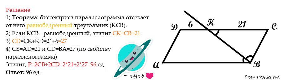 3)Биссектриса параллелограмма АВСД делит его сторону СД на отрезки СК=21, КД=6. Найдите его периметр. (5баллов)