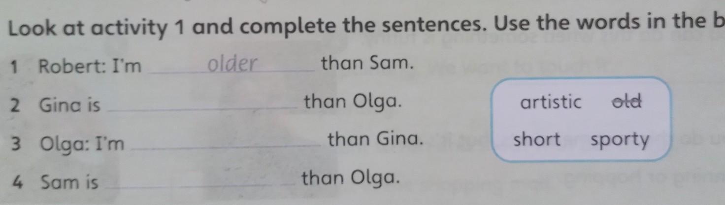 2 Look at activity 1 and complete the sentences. Use the words in the box. 1 Robert: I'm older than Sam. 2 3 4 Ging is Olga: I'm Sam is than Olga. than Gina. than Olga. artistic old short sporty