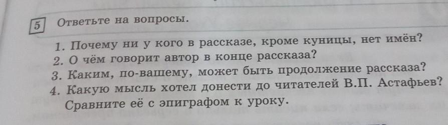 Ответьте на вопросы. [5] 1. Почему ни у кого в рассказе, кроме куницы, нет имён? 2. О чём говорит автор в конце рассказа? 4. Какую мысль хотел донести до читателей В.П. Астафьев? 3. Каким, по-вашему, может быть продолжение рассказа? Сравните её с эпиграфом к уроку.