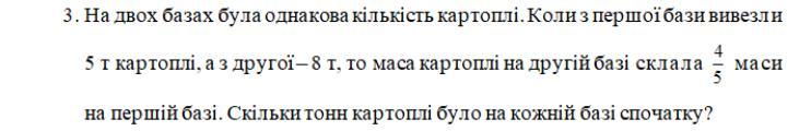 На двох базах була однакова кількість картоплі. Коли з першої бази вивезли 5 т картоплі, а з другої – 8 т, то маса картоплі на другій базі склала 4/5 маси на першій базі. Скільки тонн картоплі було на кожній базі спочатку?