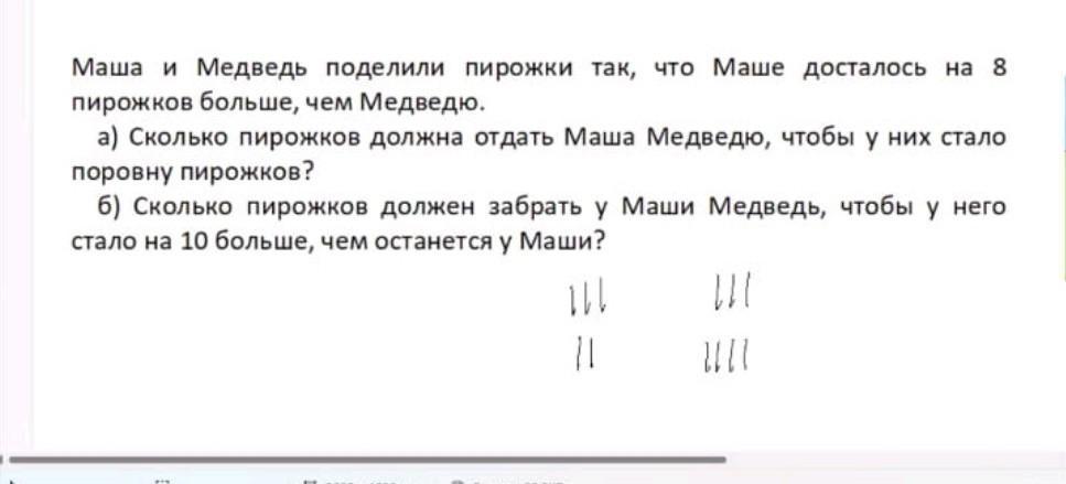 Маша и Медведь поделили пирожки так, что Маше досталось на 8 пирожков больше, чем Медведю. а) Сколько пирожков должна отдать Маша Медведю, чтобы у них стало поровну пирожков? б) Сколько пирожков должен забрать у Маши Медведь, чтобы у него стало на 10 больше, чем останется у Маши? Ш II Ш ||||