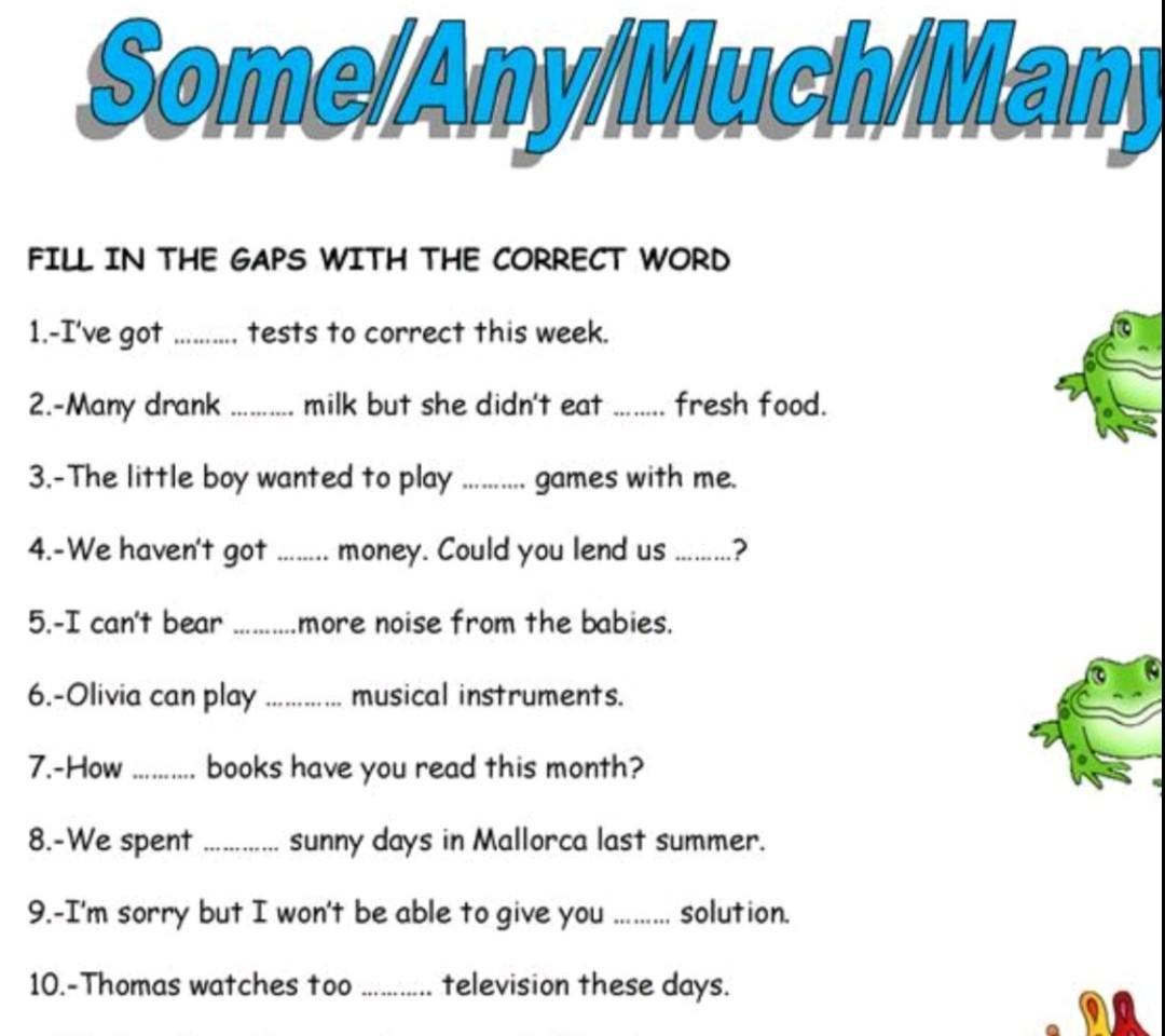 1 any 2 many 3 some 4any 5some 6some 7much 8some 9 any 10 some