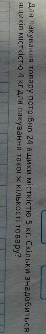 для пакування товару потрiбно 24 ячики Mİскістю 5 кг . Скiльки 3надобиться ящиків MİCTKİCTю 4 кг для пакування такої ж кiлькостİ товapy ?