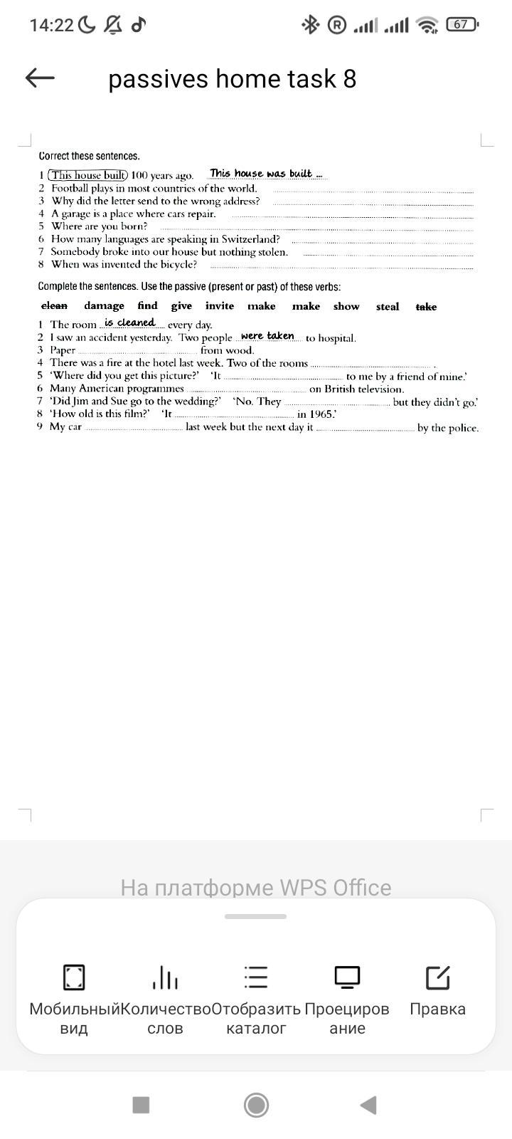 The room is cleaned every day. saw an accident yesterday. Two people were taken to hospital. Paper is made from wood. There was a fire at the hotel last week. Two of the rooms were damaged. 'Where did you get this picture?'