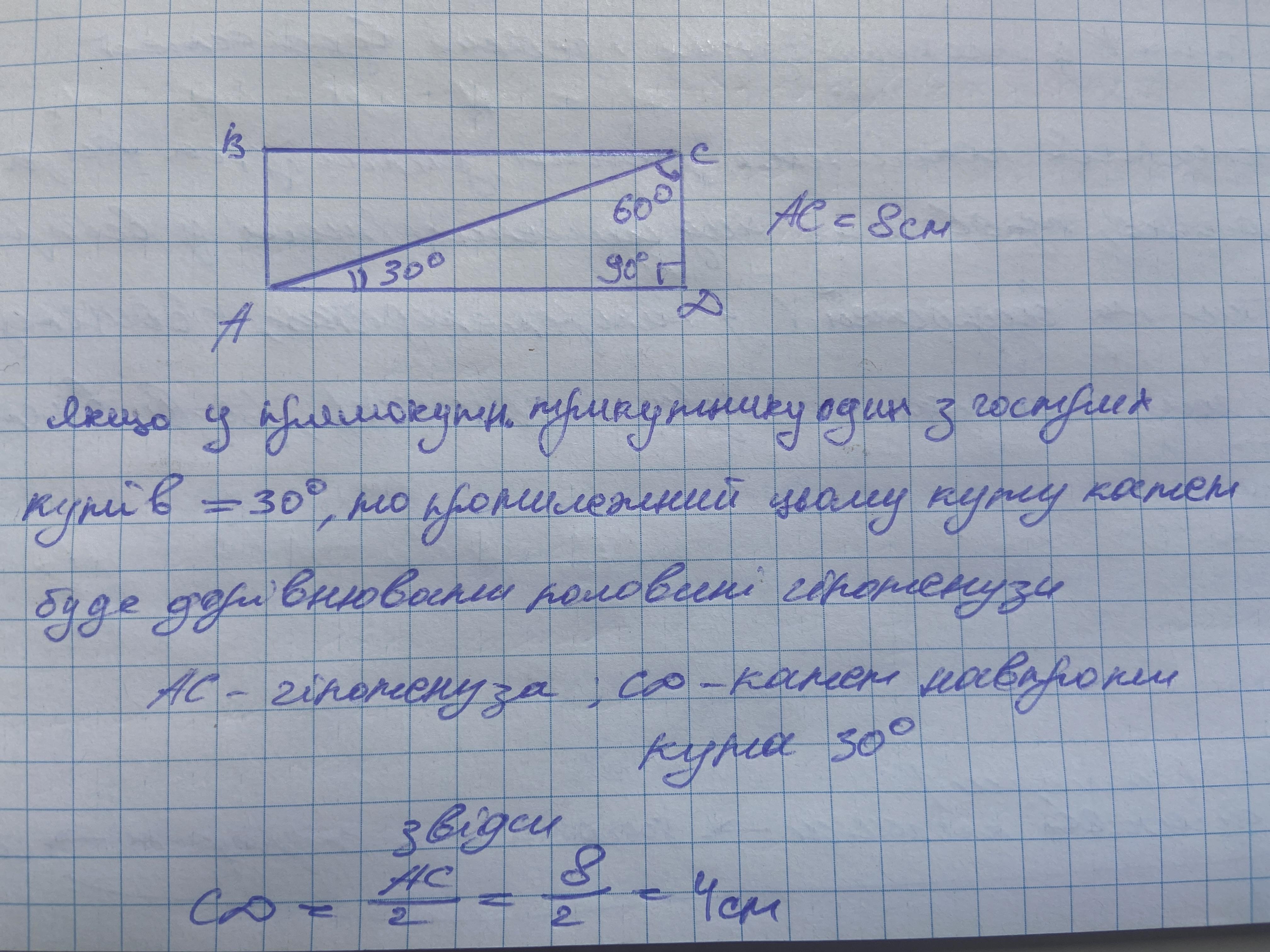Діагональ прямокутника, що утворює з меншою його стороною кут 60°, дорівнює 8 см.