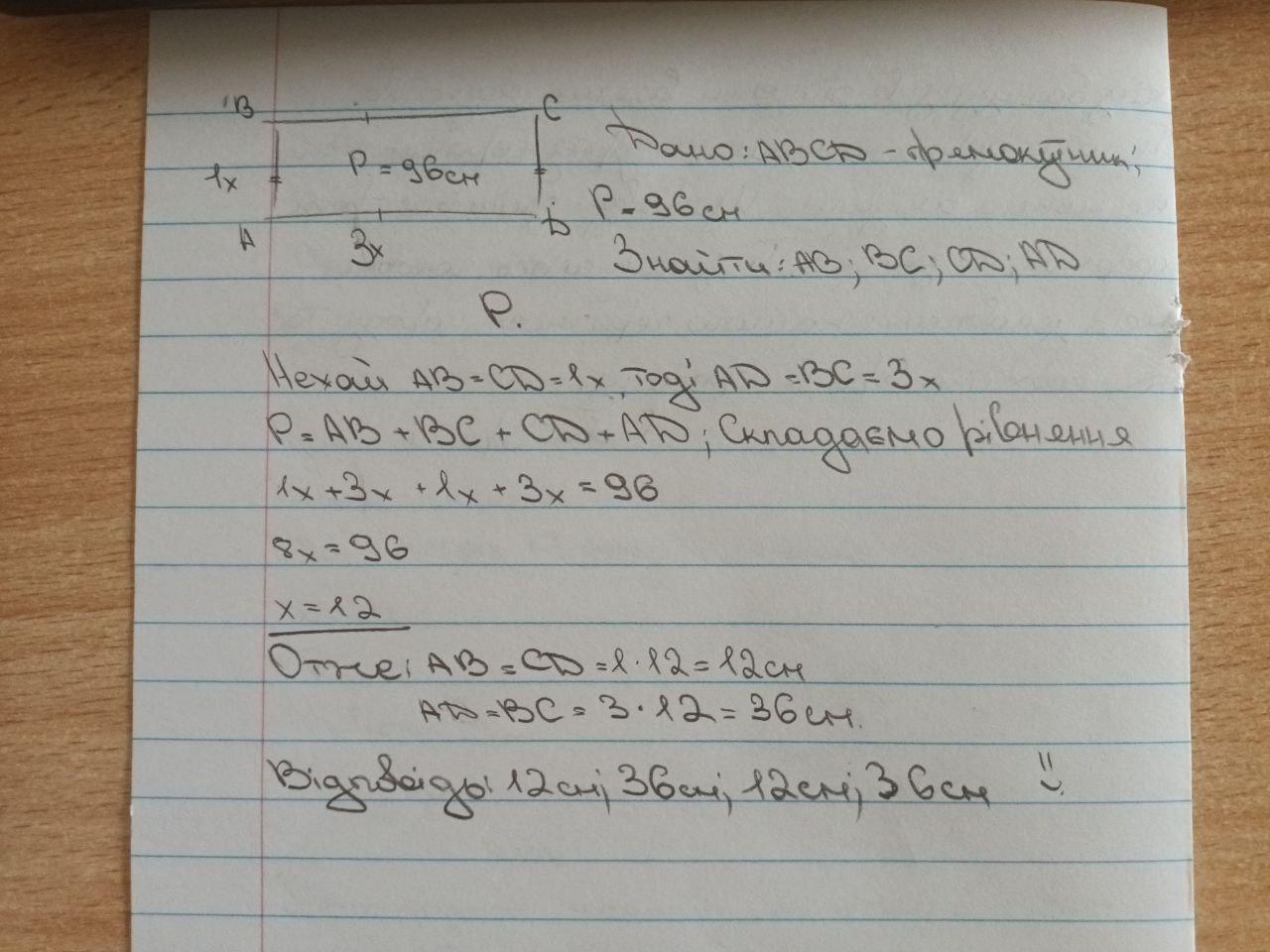 периметр прямокутника дорівнює 96 см. знайдіть його сторони якщо вони відносяться як 1:3